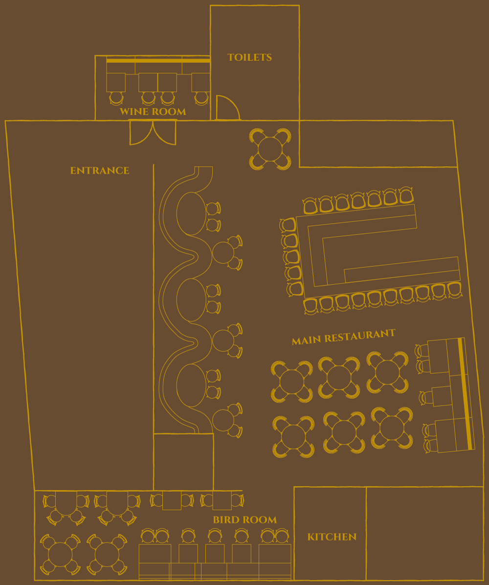 Ontdek de verschillende settings binnen Moeders Mooiste en kies de plek die bij jouw avond past. Van het levendige Main Restaurant tot de sfeervolle Bird Room en intieme Wine Room, ervaar de sfeer en vind jouw ideale plek op de plattegrond.